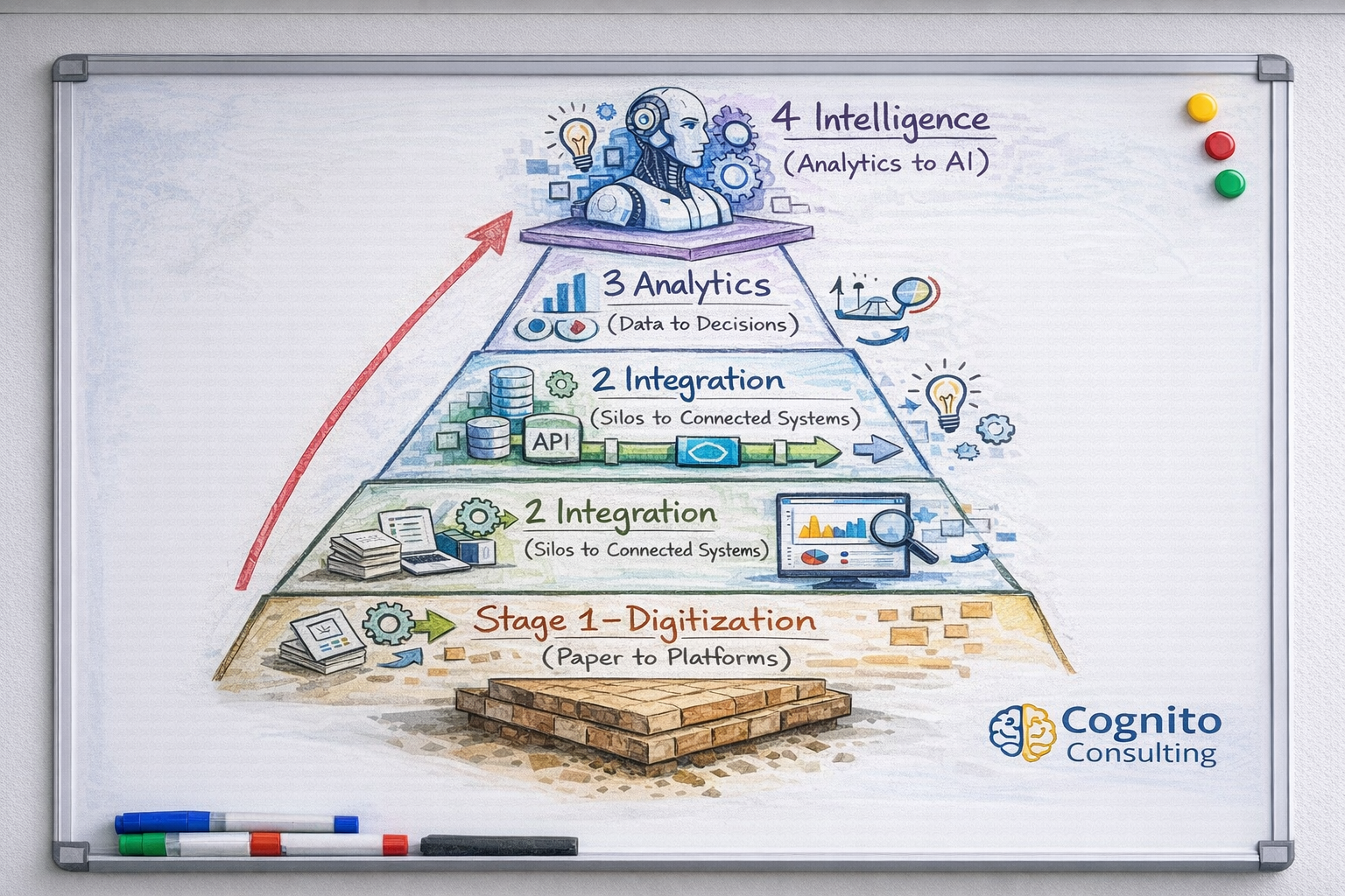 Stage 1 – Digitization (From Paper to Platforms) Getting core processes onto digital tools. ERP for procurement and finance. Project management software for scheduling. Field apps for site data collection. This is the foundation layer.
