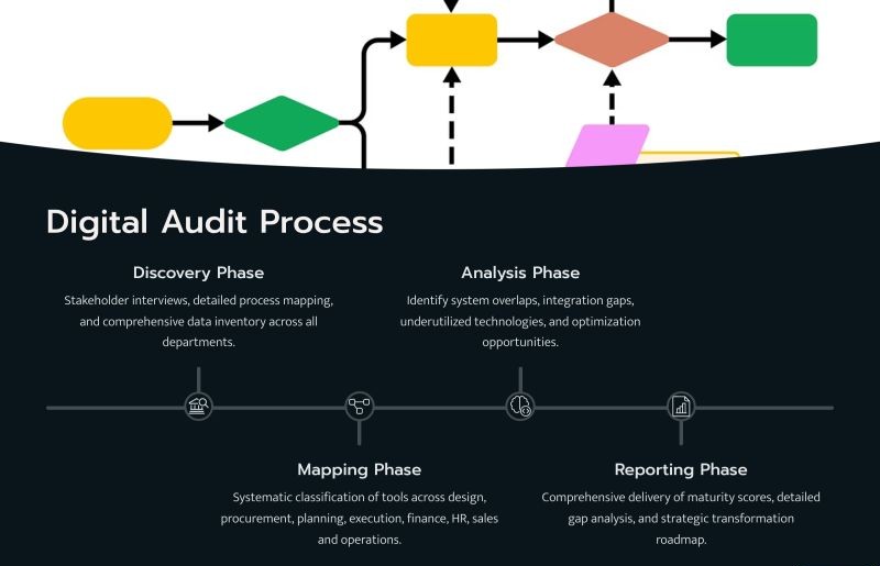 Phase 2 – Tool Mapping (Weeks 2–3) We map your current processes against the tools in use — across departments like BD, Design, Procurement, Finance, Project Execution, and CRM. We identify where tools exist but aren’t used, where processes exist but aren’t digital, and where there’s no process at all. This phase often surfaces surprises even for leadership teams who believe they have a good handle on operations.